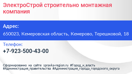 ЭлектроСтрой, строительно-монтажная компания по адресу 650023, Кемеровская область, Кемерово, Терешковой, 18 в дальнейшем Организация, размещена в следующих категориях: