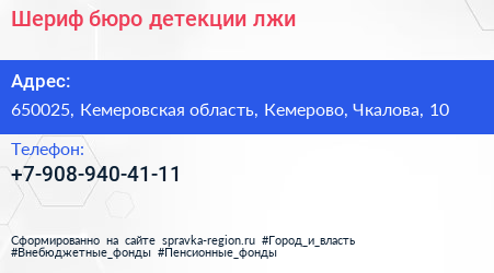 Шериф, бюро детекции лжи по адресу 650025, Кемеровская область, Кемерово, Чкалова, 10 в дальнейшем Организация, размещена в следующих категориях: