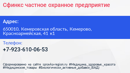 Сфинкс, частное охранное предприятие по адресу 650010, Кемеровская область, Кемерово, Красноармейская, 41 к1 в дальнейшем Организация, размещена в следующих категориях: