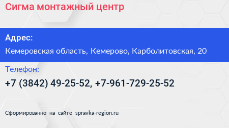 Сигма, монтажный центр по адресу Кемеровская область, Кемерово, Карболитовская, 20 в дальнейшем Организация, размещена в следующих категориях: