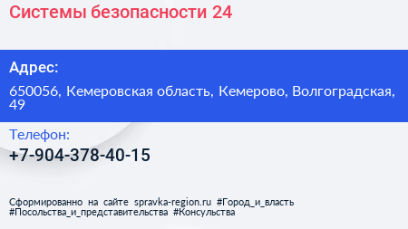 Системы безопасности-24 по адресу 650056, Кемеровская область, Кемерово, Волгоградская, 49 в дальнейшем Организация, размещена в следующих категориях: