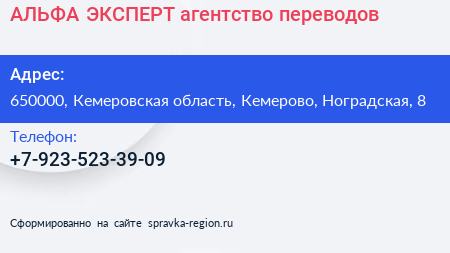 АЛЬФА-ЭКСПЕРТ, агентство переводов по адресу 650000, Кемеровская область, Кемерово, Ноградская, 8 в дальнейшем Организация, размещена в следующих категориях: