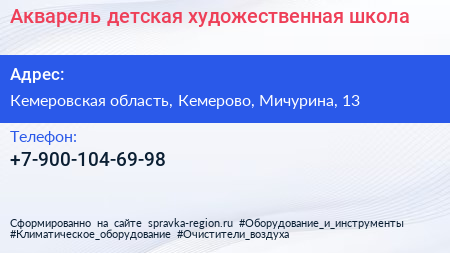 Акварель, детская художественная школа по адресу Кемеровская область, Кемерово, Мичурина, 13 в дальнейшем Организация, размещена в следующих категориях: