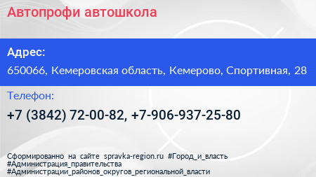 Автопрофи, автошкола по адресу 650066, Кемеровская область, Кемерово, Спортивная, 28 в дальнейшем Организация, размещена в следующих категориях:
