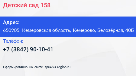 Детский сад №158 по адресу 650905, Кемеровская область, Кемерово, Белозёрная, 40Б в дальнейшем Организация, размещена в следующих категориях: