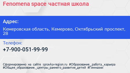 Fenomena.space, частная школа по адресу Кемеровская область, Кемерово, Октябрьский проспект, 28 в дальнейшем Организация, размещена в следующих категориях: