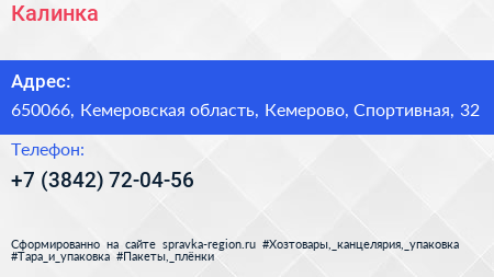 Калинка по адресу 650066, Кемеровская область, Кемерово, Спортивная, 32 в дальнейшем Организация, размещена в следующих категориях: