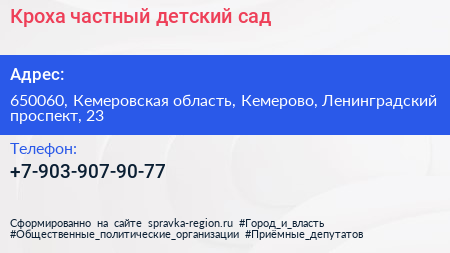 Кроха, частный детский сад по адресу 650060, Кемеровская область, Кемерово, Ленинградский проспект, 23 в дальнейшем Организация, размещена в следующих категориях: