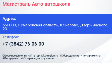 Магистраль-Авто, автошкола по адресу 650000, Кемеровская область, Кемерово, Дзержинского, 20 в дальнейшем Организация, размещена в следующих категориях: