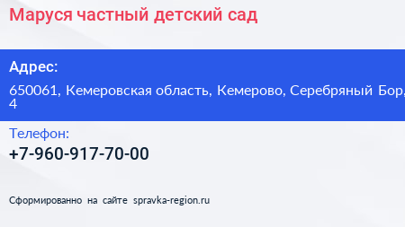 Маруся, частный детский сад по адресу 650061, Кемеровская область, Кемерово, Серебряный Бор, 4 в дальнейшем Организация, размещена в следующих категориях: