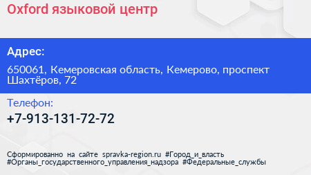 Oxford, языковой центр по адресу 650061, Кемеровская область, Кемерово, проспект Шахтёров, 72 в дальнейшем Организация, размещена в следующих категориях: