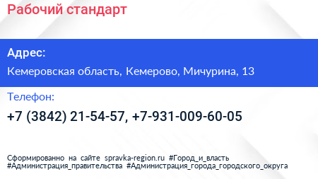 Рабочий стандарт по адресу Кемеровская область, Кемерово, Мичурина, 13 в дальнейшем Организация, размещена в следующих категориях: