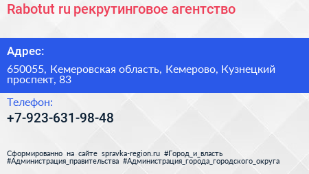 Rabotut.ru, рекрутинговое агентство по адресу 650055, Кемеровская область, Кемерово, Кузнецкий проспект, 83 в дальнейшем Организация, размещена в следующих категориях: