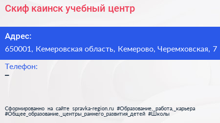 Скиф-каинск, учебный центр по адресу 650001, Кемеровская область, Кемерово, Черемховская, 7 в дальнейшем Организация, размещена в следующих категориях: