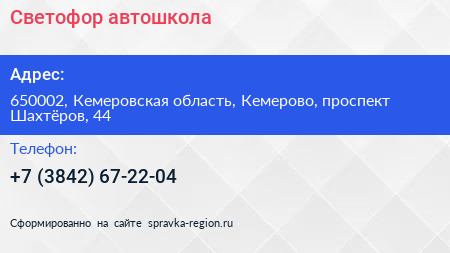 Светофор, автошкола по адресу 650002, Кемеровская область, Кемерово, проспект Шахтёров, 44 в дальнейшем Организация, размещена в следующих категориях: