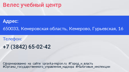 Велес, учебный центр по адресу 650033, Кемеровская область, Кемерово, Гурьевская, 16 в дальнейшем Организация, размещена в следующих категориях: