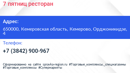 7 пятниц, ресторан по адресу 650000, Кемеровская область, Кемерово, Орджоникидзе, 4 в дальнейшем Организация, размещена в следующих категориях: