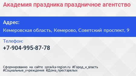 Академия праздника, праздничное агентство по адресу Кемеровская область, Кемерово, Советский проспект, 9 в дальнейшем Организация, размещена в следующих категориях: