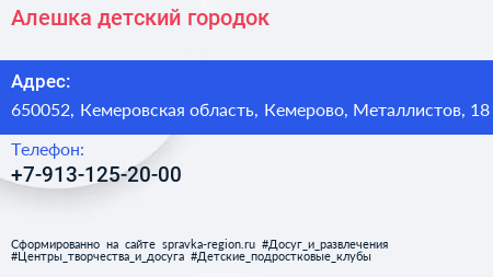 Алешка, детский городок по адресу 650052, Кемеровская область, Кемерово, Металлистов, 18 в дальнейшем Организация, размещена в следующих категориях: