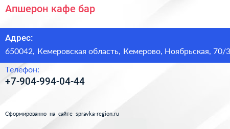 Апшерон, кафе-бар по адресу 650042, Кемеровская область, Кемерово, Ноябрьская, 70/3 в дальнейшем Организация, размещена в следующих категориях: