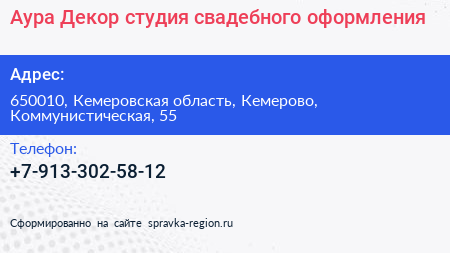 Аура Декор, студия свадебного оформления по адресу 650010, Кемеровская область, Кемерово, Коммунистическая, 55 в дальнейшем Организация, размещена в следующих категориях: