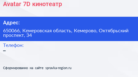 Avatar, 7D кинотеатр по адресу 650066, Кемеровская область, Кемерово, Октябрьский проспект, 34 в дальнейшем Организация, размещена в следующих категориях:
