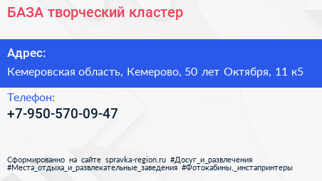 БАЗА, творческий кластер по адресу Кемеровская область, Кемерово, 50 лет Октября, 11 к5 в дальнейшем Организация, размещена в следующих категориях: