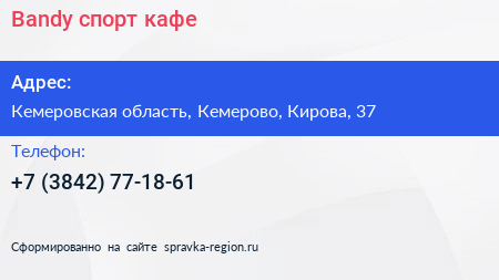 Bandy, спорт-кафе по адресу Кемеровская область, Кемерово, Кирова, 37 в дальнейшем Организация, размещена в следующих категориях: