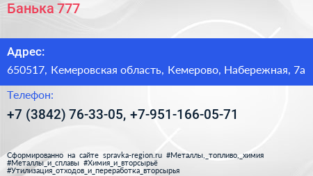 Банька 777 по адресу 650517, Кемеровская область, Кемерово, Набережная, 7а в дальнейшем Организация, размещена в следующих категориях: