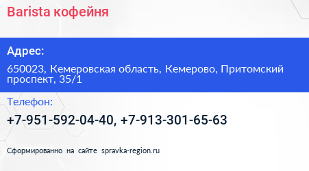 Barista, кофейня по адресу 650023, Кемеровская область, Кемерово, Притомский проспект, 35/1 в дальнейшем Организация, размещена в следующих категориях: