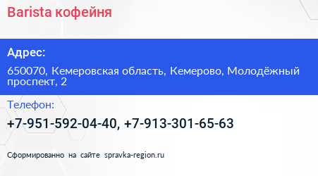 Barista, кофейня по адресу 650070, Кемеровская область, Кемерово, Молодёжный проспект, 2 в дальнейшем Организация, размещена в следующих категориях: