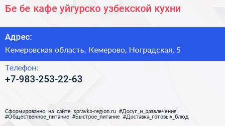 Бе-бе, кафе уйгурско-узбекской кухни по адресу Кемеровская область, Кемерово, Ноградская, 5 в дальнейшем Организация, размещена в следующих категориях: