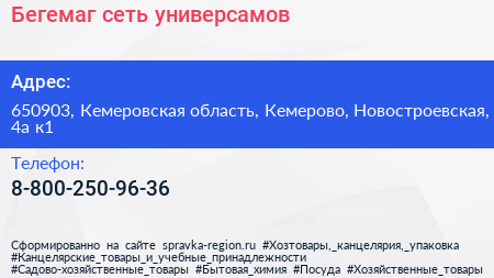 Бегемаг, сеть универсамов по адресу 650903, Кемеровская область, Кемерово, Новостроевская, 4а к1 в дальнейшем Организация, размещена в следующих категориях: