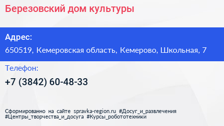 Березовский, дом культуры по адресу 650519, Кемеровская область, Кемерово, Школьная, 7 в дальнейшем Организация, размещена в следующих категориях: