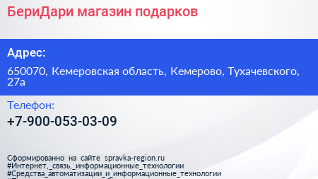 БериДари, магазин подарков по адресу 650070, Кемеровская область, Кемерово, Тухачевского, 27а в дальнейшем Организация, размещена в следующих категориях: