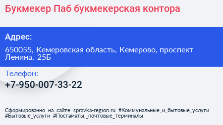 Букмекер Паб, букмекерская контора по адресу 650055, Кемеровская область, Кемерово, проспект Ленина, 25Б в дальнейшем Организация, размещена в следующих категориях: