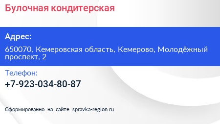 Булочная-кондитерская по адресу 650070, Кемеровская область, Кемерово, Молодёжный проспект, 2 в дальнейшем Организация, размещена в следующих категориях: