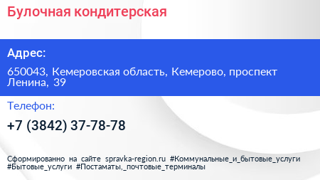 Булочная-кондитерская по адресу 650043, Кемеровская область, Кемерово, проспект Ленина, 39 в дальнейшем Организация, размещена в следующих категориях: