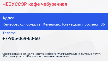 ЧЕБУССЭР, кафе - чебуречная по адресу Кемеровская область, Кемерово, Кузнецкий проспект, 36 в дальнейшем Организация, размещена в следующих категориях: