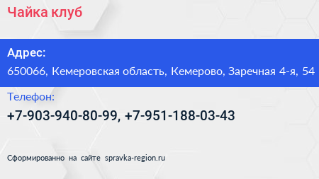 Чайка, клуб по адресу 650066, Кемеровская область, Кемерово, Заречная 4-я, 54 в дальнейшем Организация, размещена в следующих категориях: