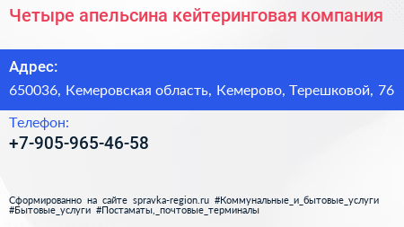 Четыре апельсина, кейтеринговая компания по адресу 650036, Кемеровская область, Кемерово, Терешковой, 76 в дальнейшем Организация, размещена в следующих категориях: