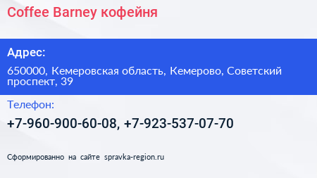 Coffee Barney, кофейня по адресу 650000, Кемеровская область, Кемерово, Советский проспект, 39 в дальнейшем Организация, размещена в следующих категориях: