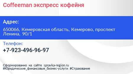 Coffeeman, экспресс-кофейня по адресу 650066, Кемеровская область, Кемерово, проспект Ленина, 90/1 в дальнейшем Организация, размещена в следующих категориях: