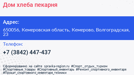 Дом хлеба, пекарня по адресу 650056, Кемеровская область, Кемерово, Волгоградская, 23 в дальнейшем Организация, размещена в следующих категориях: