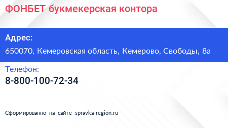 ФОНБЕТ, букмекерская контора по адресу 650070, Кемеровская область, Кемерово, Свободы, 8а в дальнейшем Организация, размещена в следующих категориях:
