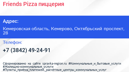 Friends Pizza, пиццерия по адресу Кемеровская область, Кемерово, Октябрьский проспект, 28 в дальнейшем Организация, размещена в следующих категориях: