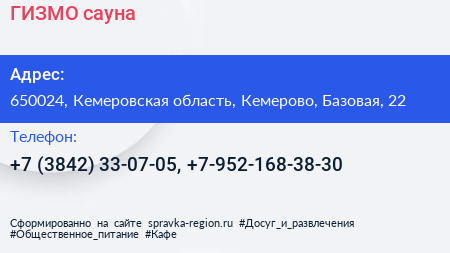 ГИЗМО, сауна по адресу 650024, Кемеровская область, Кемерово, Базовая, 22 в дальнейшем Организация, размещена в следующих категориях: