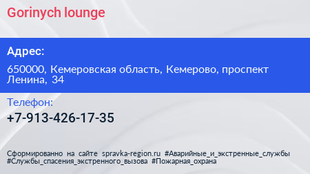 Gorinych lounge по адресу 650000, Кемеровская область, Кемерово, проспект Ленина, 34 в дальнейшем Организация, размещена в следующих категориях:
