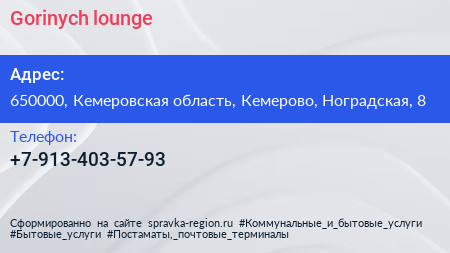 Gorinych lounge по адресу 650000, Кемеровская область, Кемерово, Ноградская, 8 в дальнейшем Организация, размещена в следующих категориях: