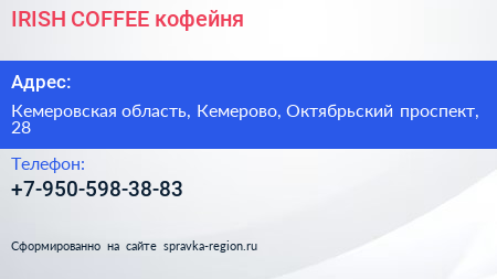 IRISH COFFEE, кофейня по адресу Кемеровская область, Кемерово, Октябрьский проспект, 28 в дальнейшем Организация, размещена в следующих категориях: